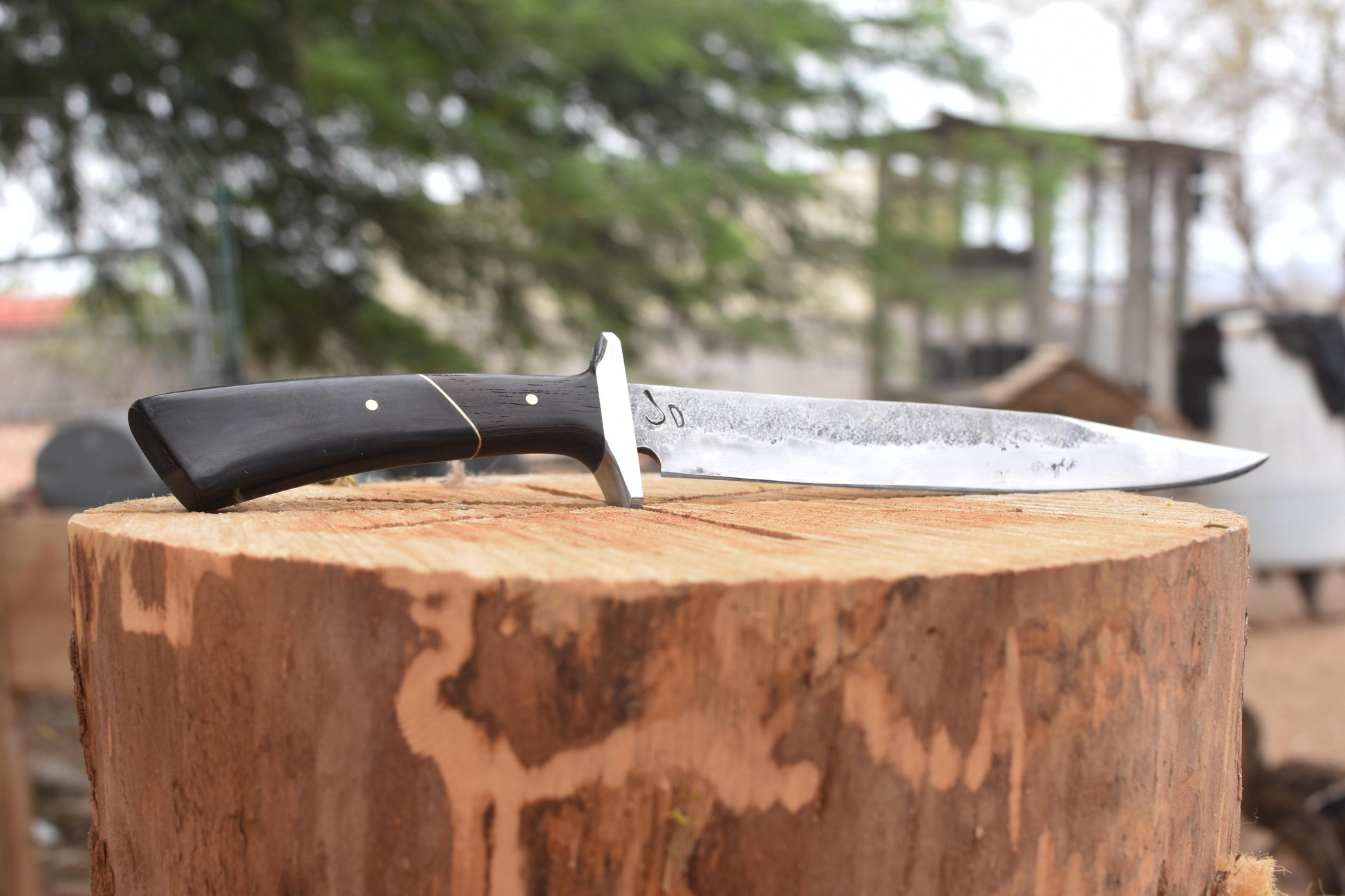 This fighting style bowie knife embodies refined toolmaking. Purposed to chop, hack, slice, and stab but plenty beautiful enough to be shown off hanging from a saddle. The classic profile, brut de forge blade finish, and bold size echo frontier-era Americana. The sleek multi-sectioned Zebrawood and horn handle offer an exotic contrast, yet remain muted enough to stay balanced both in style and in physical weight.